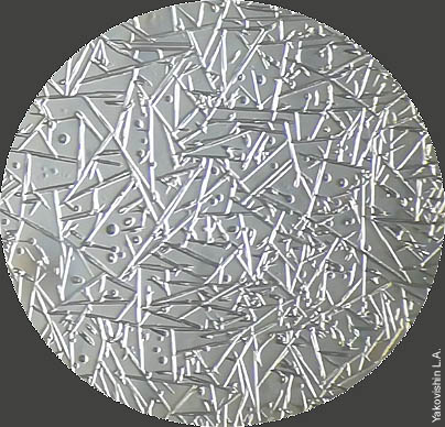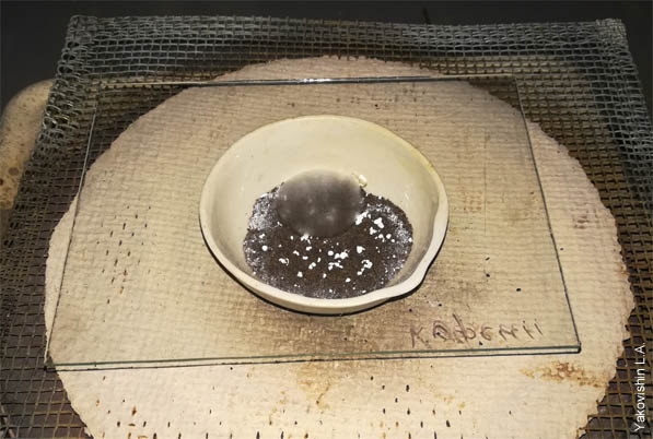Опыт проводите под тягой или в хорошо проветриваемом помещении! В фарфоровой чашке перемешайте содержимое чайного пакетика с оксидом магния в соотношении по массе 1:1. На электроплитку положите асбестовую сетку и поставьте на нее фарфоровую чашку со смесью. Накройте ее стеклянной пластинкой или часовым стеклом. Нагревание проводите в течение 1-2 мин, не допуская обугливания. Вскоре на поверхности стекла можно увидеть образование белого кольца. Это появились кристаллики кофеина и сконденсировались пары воды. Рассмотрите полученные кристаллы кофеина под микроскопом.